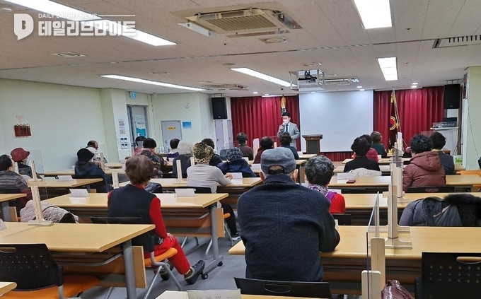 [ 데일리브라이트 ]경기도의회 안전행정위원회 김원기 의원(더불어민주당, 의정부4)이 30일(화) 오후 대한노인회 의정부시지회 부설 노인대학(학장 송영석)에서 김형두 지회장을 비롯한 50여명의 어르신들이 참석한 가운데 경기도 노인복지사업에 관한 특강을 실시하였다.