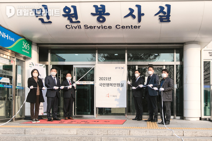 [ 데일리브라이트 ]화성시의회 원유민 의장과 기획행정위원회 황광용 위원장 및 박연숙 의원은 7일 화성시청 민원동 앞에서 열린 ‘2021년 국민행복민원실 현판식’에 참석하여 인증을 축하하였다.
