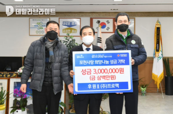 (데일리브라이트 ( DailyBright )) ㈜프로팩(대표 남경보)은 18일에 포천사랑 희망나눔 이웃돕기 성금 300만 원을 경기사회복지공동모금회를 통해 포천시에 기탁했다.