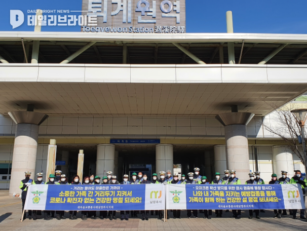 (데일리브라이트 ( DailyBright )) 새마을교통봉사대남양주시지대는 지난달 29일 퇴계원역 앞에서 설 명절 코로나19 확산 방지 캠페인을 실시했다.
