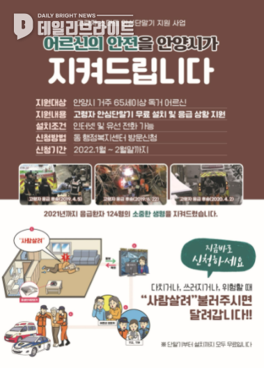 최대호 안양시장은 “위급상황 시‘사람 살려’라고 외치기만 하면 언제든 도움을 받을 수 있는 스마트안전시스템이다. 어르신들의 많은 신청과 이용을 바란다”고 권장했다.