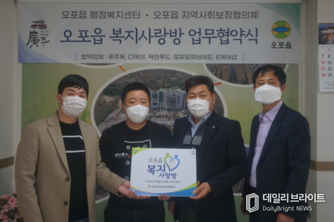 [ 데일리브라이트 ] 광주시 오포읍 행정복지센터는 3일 오포읍 지역사회보장협의체, 푸주옥, 역전푸드, 모찌모찌브레드, E헤어샵, 다께야와 함께 복지사각지대 발굴과 취약계층 지원을 위한 2021년 오포읍 복지사랑방 업무협약을 체결했다.