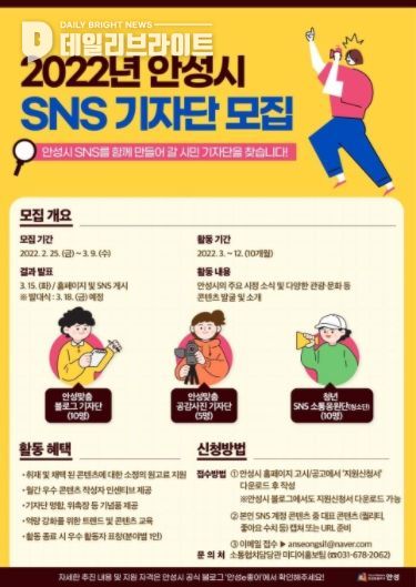[ 데일리브라이트 ] 안성시는 시 SNS에 활기를 불어 넣을 시민기자단 ‘안성시SNS기자단’을 모집한다고 4일 밝혔다.