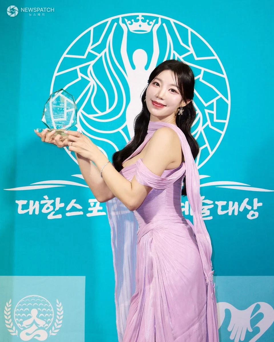 박하늘은 이날 bnt 유앤미 자원봉사단 활동과 재능기부, 스포츠인으로서의 선한 영향력 활동을 인정받아 대한스포츠문화예술대상 공로상 수상자로 선정됐다. 시상식 사전 행사로 진행된 포토월에서 박하늘은 수상의 기쁨을 표현했다.