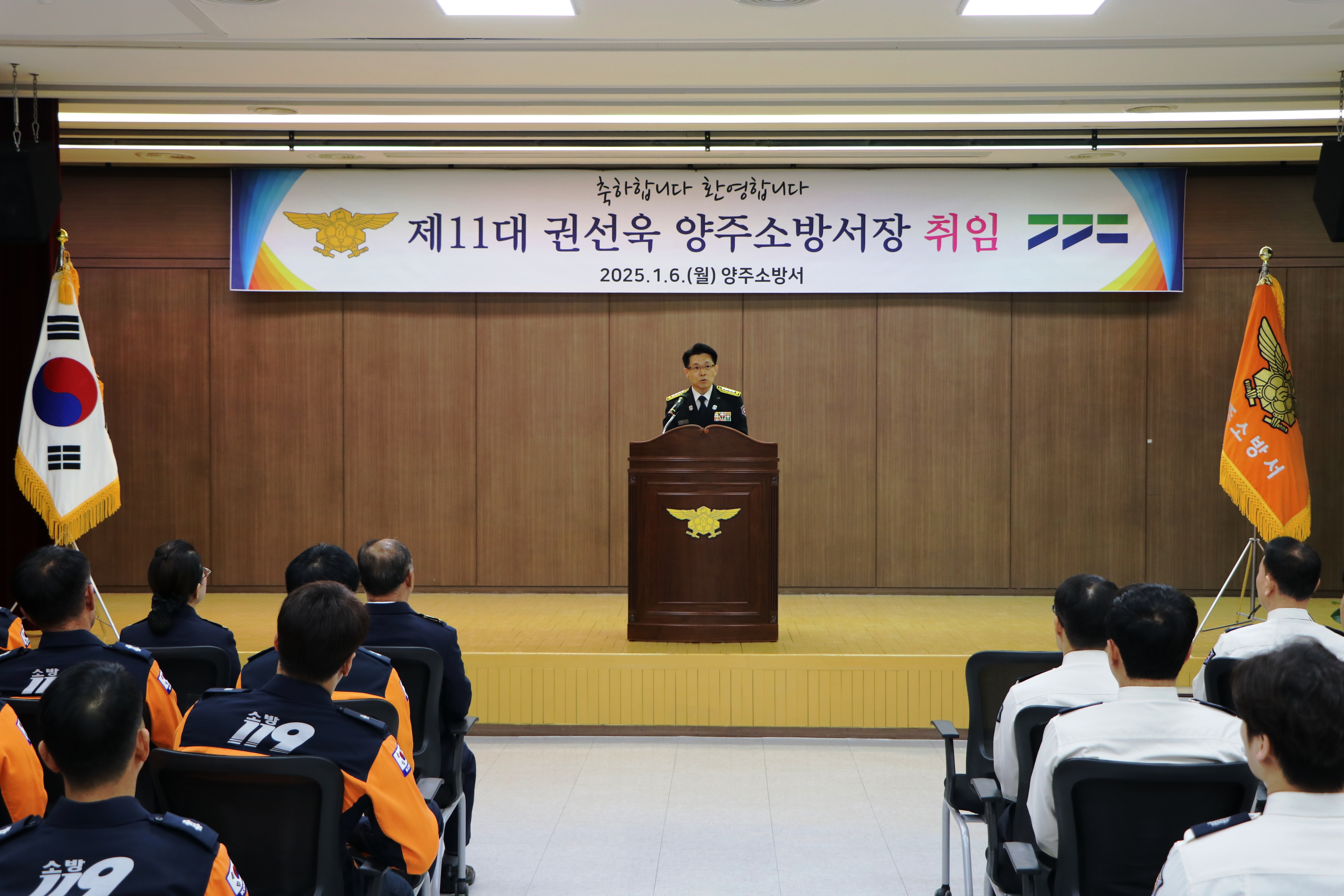 [뉴스패치 신은성 기자] 양주소방서는 6일 제11대 서장으로 취임한 권선욱 신임 서장의 취임식을 본서 3층 대회의실에서 개최했다. 이날 행사에는 소방서 직원 80여 명과 의용소방대 연합대장 등 주요 인사들이 참석한 가운데 간소하게 진행됐다. 권 서장은 취임사에서 "막중한 책임감을 느끼는 자리이지만, 직원들과 함께 기본에 충실하고 원칙을 지키며 소통하는 조직을 만들어가겠다"고 밝혔다. 또한 "현장 안전을 최우선으로 하여 지역 주민들에게 신뢰받는 양주소방서를 만들겠다"는 의지를 표명했다. 신임 서장은 특히 직원들의 자율성과 유연한 근무 환경의 중요성을 강조했다. 그는 조직 내 동기부여와 소방공무원의 사명감을 바탕으로 소방서의 핵심 가치를 재정립하겠다는 계획을 제시했다. 취임식은 내빈 소개, 약력 발표, 취임..
