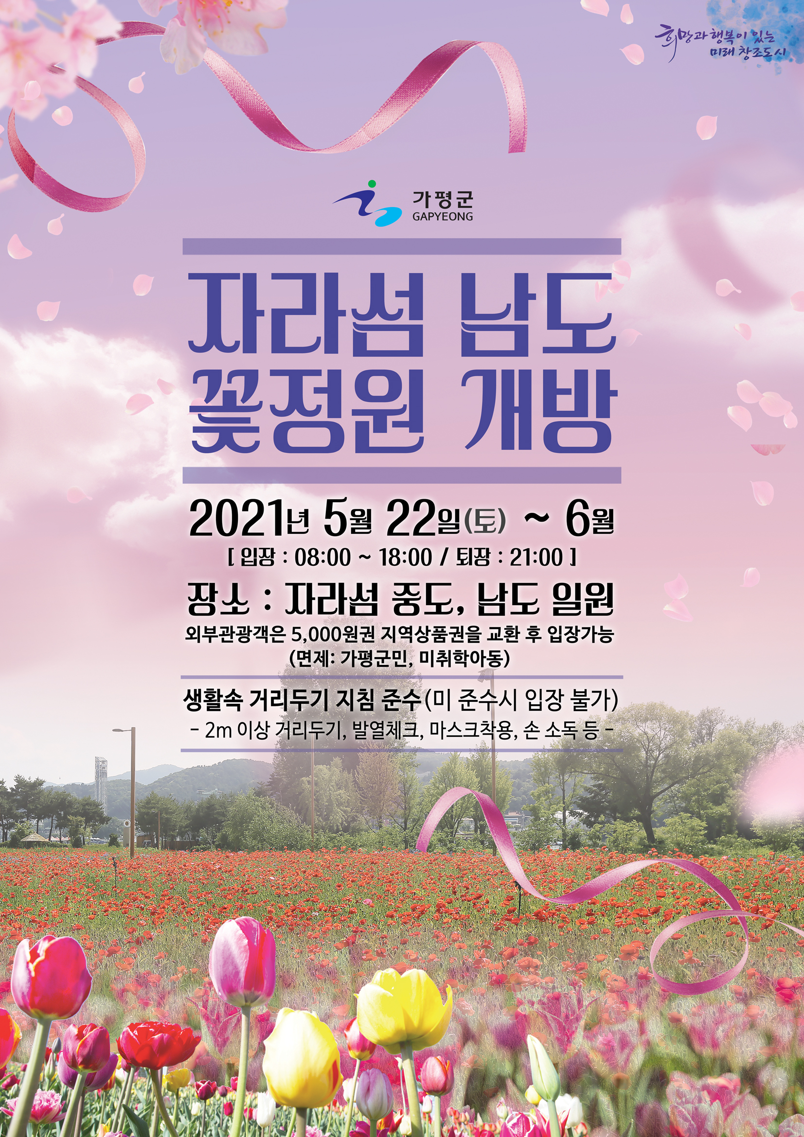 가평군의 대표관광명소인 ‘자라섬 남도 꽃 정원’이 개방과 동시, 지난 주말 2일간 3천500여명이 방문하는 등 코로나19로 지친 국민들의 갈증을 해소하고 있다. 25일 군에 따르면 코로나19로 군민들의 장기간 단절된 일상에 활력을 불어넣고 침체된 지역경제 활성화에 기여하고자 이달 22일부터 자라섬 남도 봄 꽃 정원 유료개방 행사를 진행하고 있다고 밝혔다. 첫 개방 주말 3천558명이 찾았으며, 지난 24일 평일에는 541명이 방문하는 등 3일간 4천99명이 자라섬의 자연과 다양한 꽃들로 이루어진 차별화된 볼거리 제공에 흠뻑 취했다. 이번 행사는 작년 가을에 이어 두 번째다. 군이 코로나19 장기화에 따라 지난해부터 야심차게 준비했던 꽃 축제를 개방행사로 축소하여 진행하고 있다. 지난해 첫해인 가을 개방기..