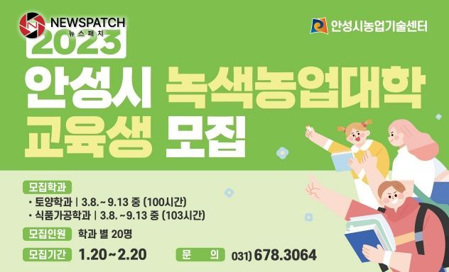 [ 뉴스패치 ] 안성시농업기술센터는 오는 20일부터 녹색농업대학 2개 과정 교육생을 모집한다고 밝혔다. 올해 녹색농업대학은 토양학과와 식품가공학과가 운영된다. 안성시민 대상 교육이며 청년 및 농업인을 우선선발한다. 모집인원은 총 40명(토양학과 20명, 식품가공학과 20명)으로 과목별 실천의지가 강한 사람을 중점 선발할 계획이다. 교육은 3월 개강식을 시작으로 9월 수료식까지 진행될 예정이다. 토양학과는 모든 농작물 생산에 기본이 되는 토양, 비료, 미생물 등의 교육으로 토양분석 및 관리를 통해 고품질 농산물을 생산하는 안성시 농업인을 육성한다. 식품가공학과는 이론과 실습 과정을 통해 농산물 가공능력을 갖춘 6차산업 인력 양성을 목표로 하고 있다.