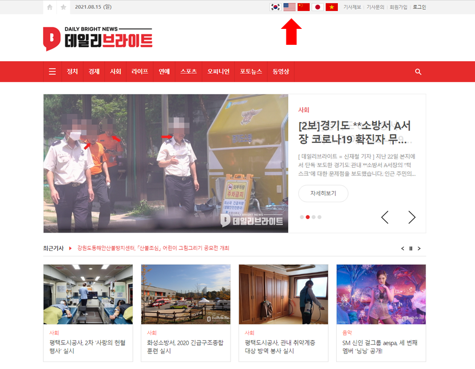 데일리브라이트, 5개국어로( 한국, 영어, 중국, 일본, 베트남) 지원된다 데일리브라이트신문사는 다문화가정의 지원을 돕고 세계화에 눈 높이를 맞추기 위해 5개국 언어( 한국, 영어, 중국, 일본, 베트남)로8월 13일부터 제공한다. 방법은 간단하다. 신문의 상단 오른쪽 나라별 국기를 클릭하면 해당 언어로 변환된다. [뉴스]사회문화 2021.08.15