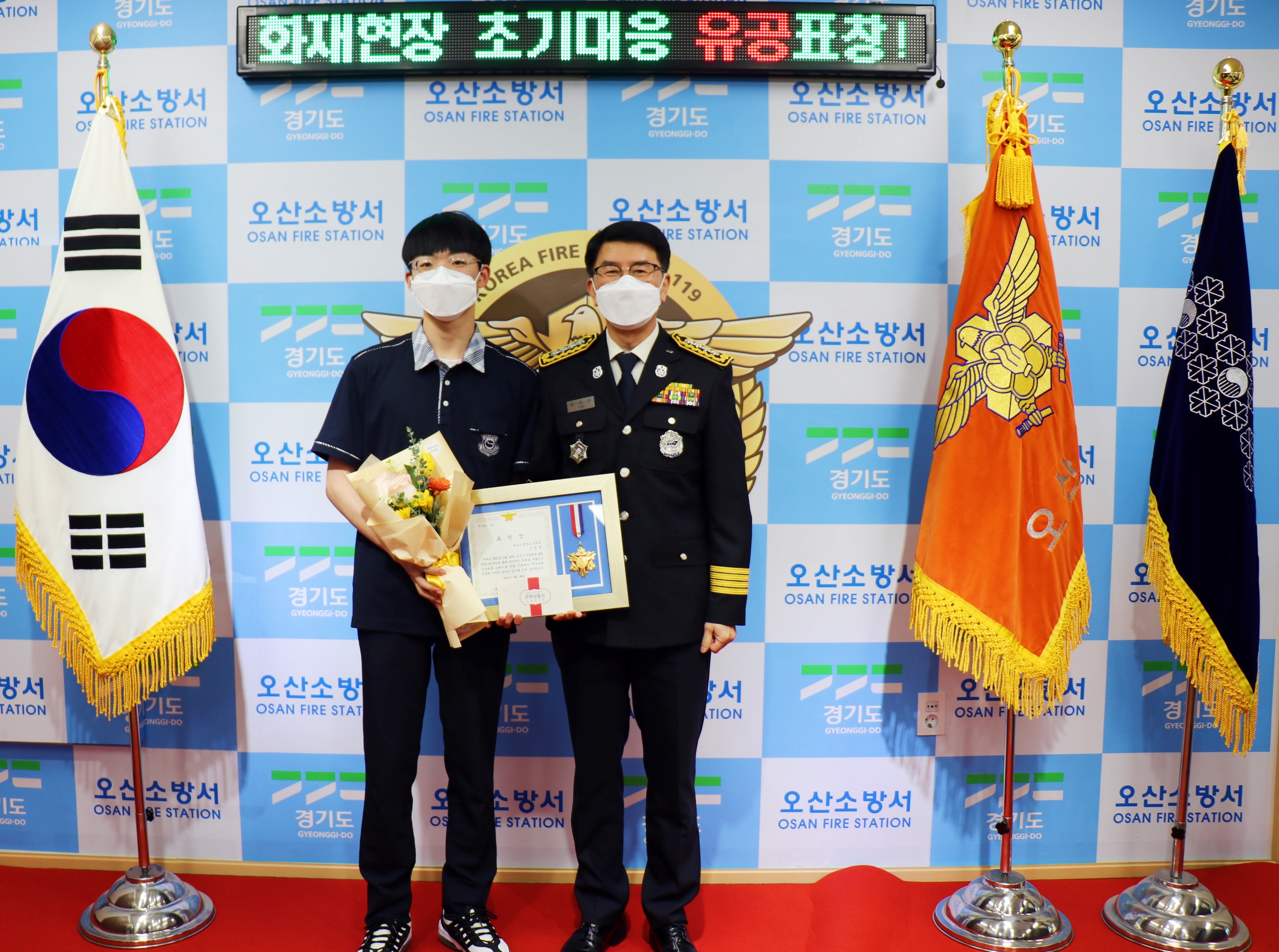 [ 데일리브라이트 = 신재철 기자 ] 오산소방서(서장 윤성근)는 소화기로 신속하게 화재를 초기 진압한 고등학생 김영훈군(세교고등학교 2학년)에게 재산피해 저감에 대한 공적을 인정하여 표창을 수여한다고 30일 밝혔다. 지난 2월 23일 12시 29분경 오산시 수청동 아파트에 거주하는 김군은 옆집에서 불이 났다는 소리를 듣고, 옆집 거실로 들어가 팬트리창고 분전함 부근에서 발생한 화재를 목격하고 집 안에 있던 소화기로 신속하게 화재를 진화하였다. 김군은 평소 근면, 성실한 품성으로 묵묵히 자신의 본분에 최선을 다하는 학생으로 이번 재난 상황에서는 위험을 무릅쓰고 침착하고도 신속하게 화재를 진화하여 인명과 재산피해 저감에 높은 공적을 인정받아 표창을 수여하게 되었다. 윤성근 오산소방서장은 “이번 화재는 소화기..