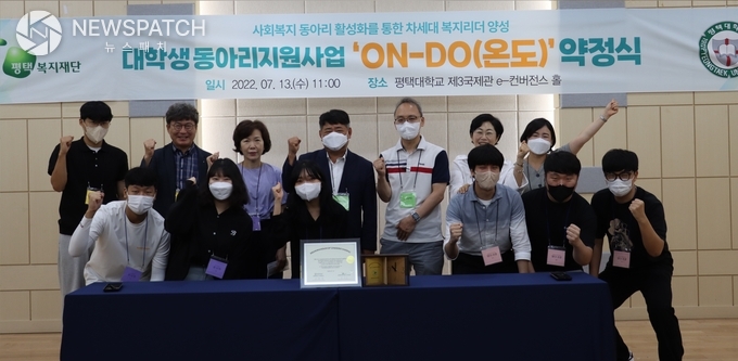 [ 뉴스패치 = 이재은 기자 ] (재)평택복지재단(사무처장 정문호)은 지난 7월 13일(수) 평택대학교 제3국제관 e-컨버전스 홀에서 상생·연대의 가치실현을 위한‘대학생 동아리지원사업’교류·협력 약정식을 진행했다. 이날 약정식은 평택복지재단이 평택대학교 산학협력단을 통해 사회복지학과 동아리 3개를 추천받아 동아리별 200만원 총 600만원의 활동비 지원을 약속하는 자리였다. 평택복지재단 정문호 사무처장을 비롯해 평택대학교 산학협력단 이태규 단장, 사회복지학과 신승연 교수, 손병돈 교수, 최승희 교수와 지원대상인 평택대학교 사회복지학과 3개 동아리원들이 참석하였다. 참석자 소개, 기관 대표 인사말, 약정 및 협약체결, 동아리 소개 등으로 진행된 이번 행사에서 양 기관은 상호협력체계를 구축하고 지역사회복지 ..